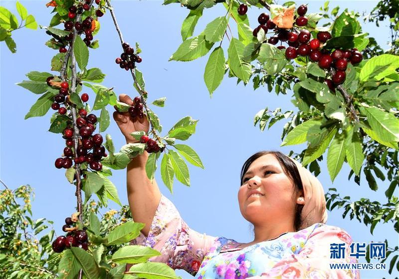 6月12日,在塔吉克斯坦首都杜尚别以西的吉萨尔,吉萨尔樱桃园的员工采摘樱桃。新华社记者沙达提摄