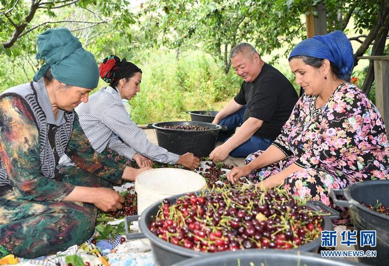 6月12日,在塔吉克斯坦首都杜尚别以西的吉萨尔,吉萨尔樱桃园的主人、世纪驼队公司董事长康忠玉(后右)与员工一起分拣樱桃。 新华社记者沙达提摄