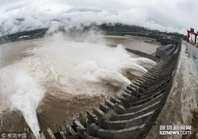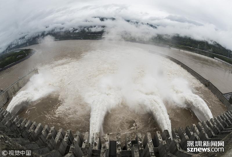 2018年7月5日,湖北宜昌,江水通过三峡大坝泄洪深孔下泄。