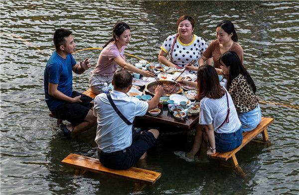 2018年8月21日傍晚,游客在重庆南川金佛山西坡景区碧潭幽谷“烫”水上火锅。
