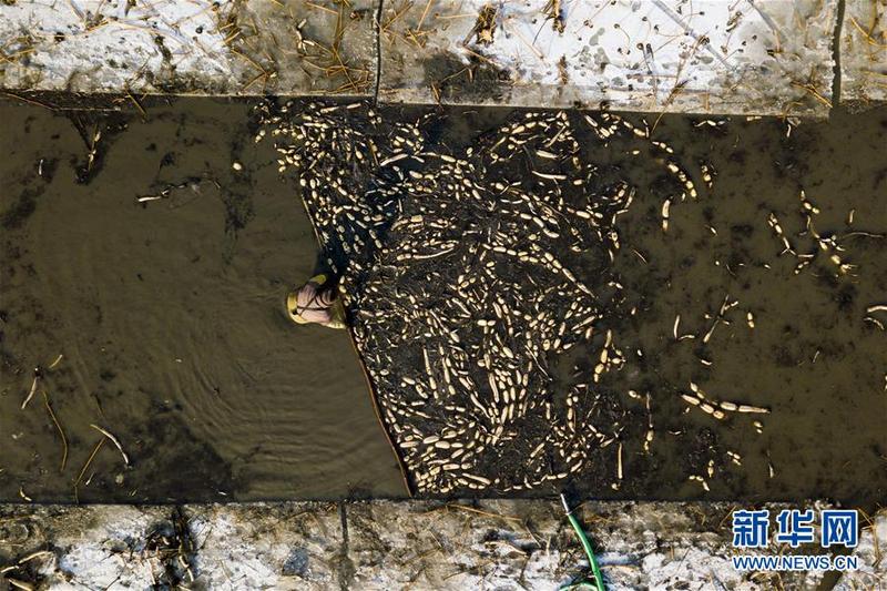 2月1日,在雄安新区安新县东向阳村的一处藕塘,一名挖藕工将挖出来的藕推向塘边(无人机航拍)。新华社记者沈伯韩摄