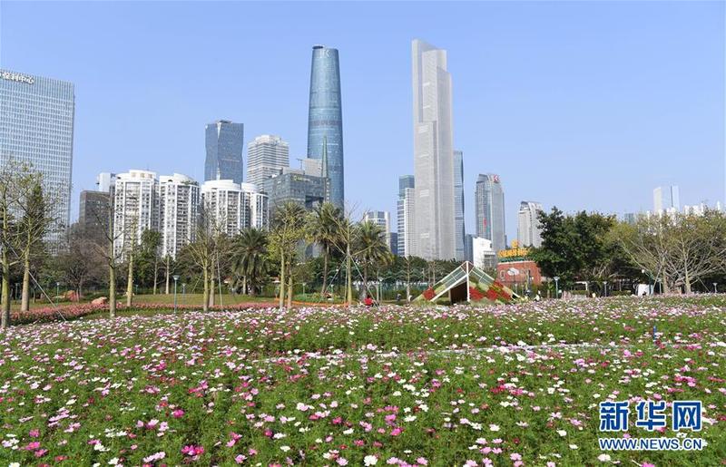 鲜花映衬下的广州珠江新城(3月3日摄)。 新华社记者 邓华 摄