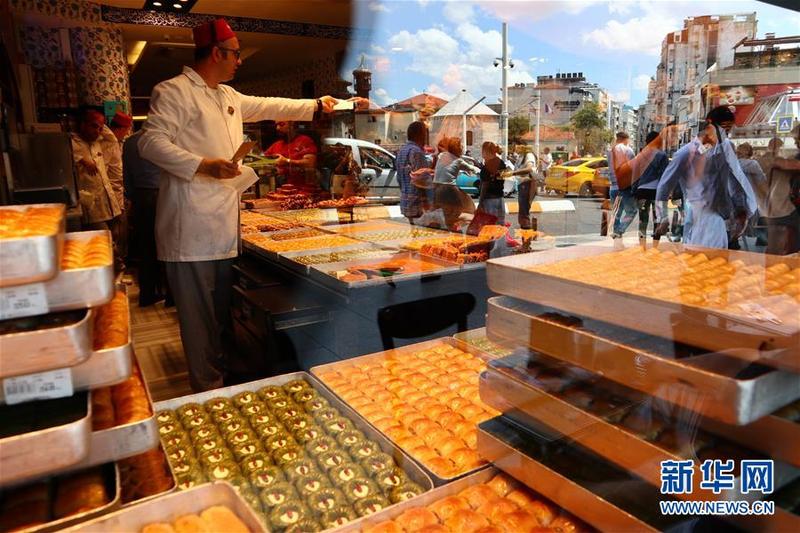 这是8月18日在土耳其伊斯坦布尔塔克西姆广场拍摄的一家销售“巴克拉瓦”的甜品店。新华社记者徐速绘摄
