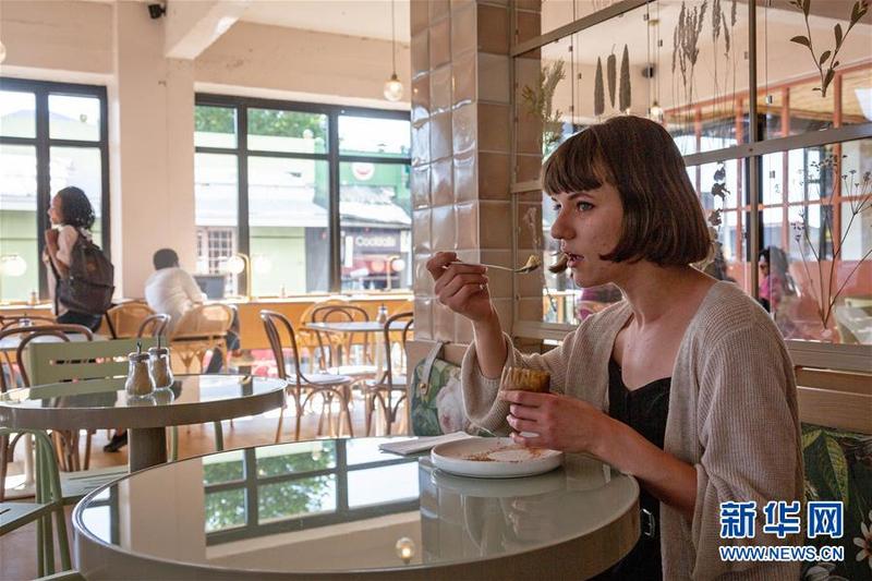 9月10日,在南非约翰内斯堡一家甜品店内,顾客正在品尝牛奶蛋挞。新华社发(耶希尔摄)