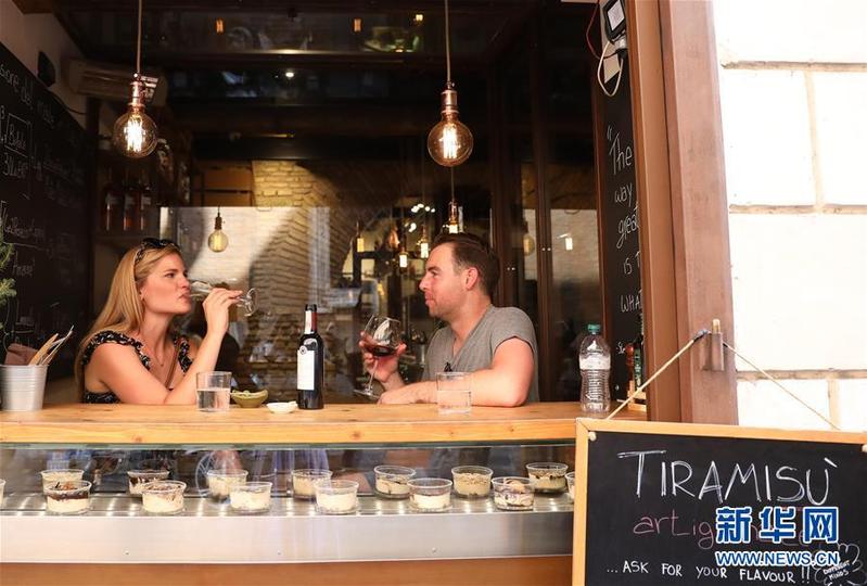新8月23日,在意大利首都罗马的一家餐厅,两名游客在售卖提拉米苏的店铺中享受悠闲时光。新华社记者程婷婷摄
