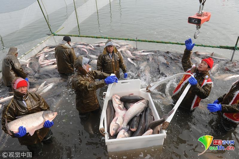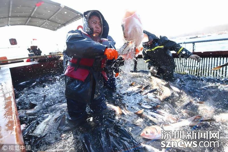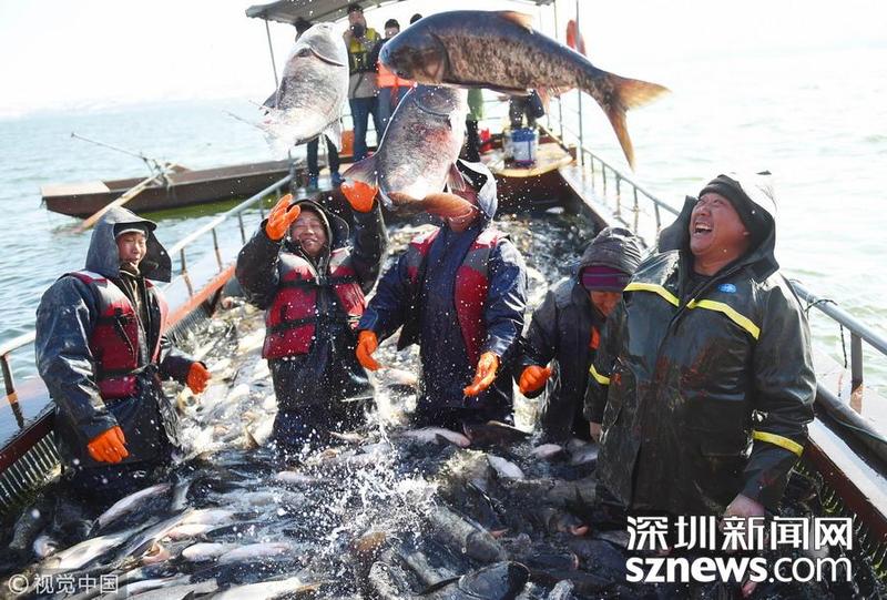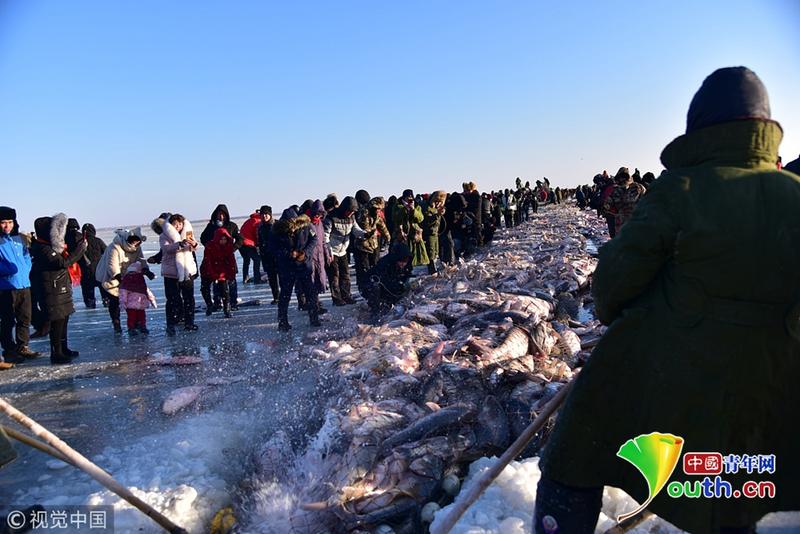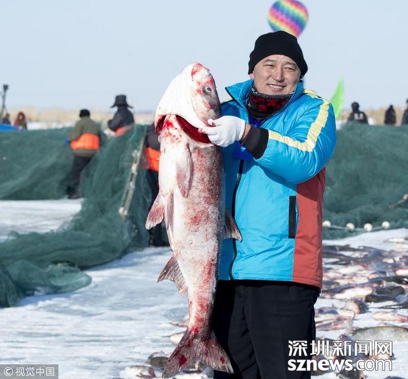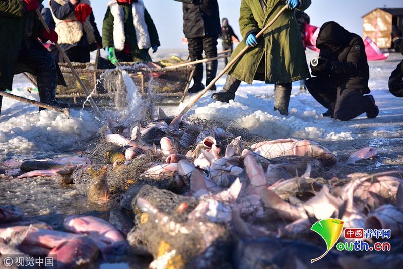 2018年12月26日,吉林松原,查干湖迎来了“红网”,单网捕捞约30万斤。