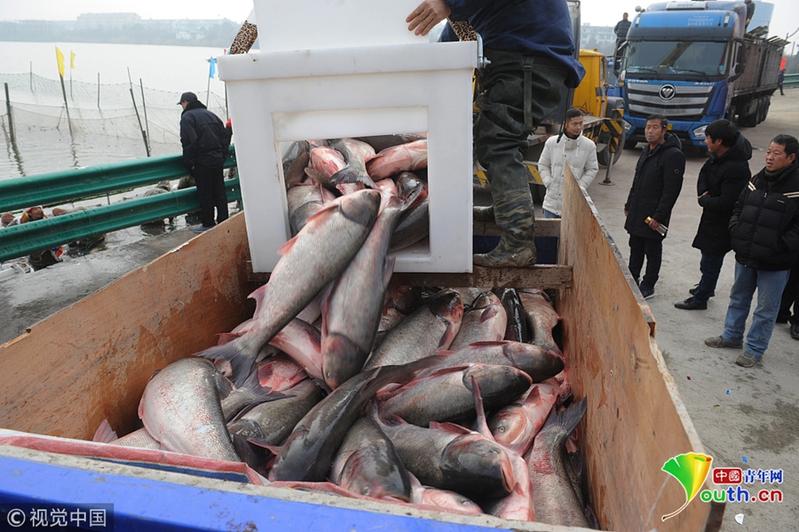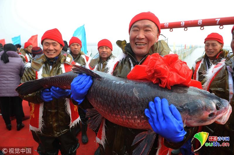 2019年1月6日,安徽省阜阳市颍上县八里河渔场正式开始进行冬季大捕鱼,捕获的一条重达78斤的“头鱼”拍出88万元,现场吸引众多客商和广大群众观看。