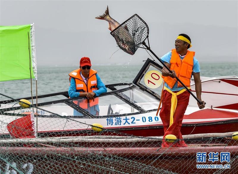 2019年6月22日,博湖县的鱼把头将开湖季打的第一网鱼捞起。新华社记者赵戈摄