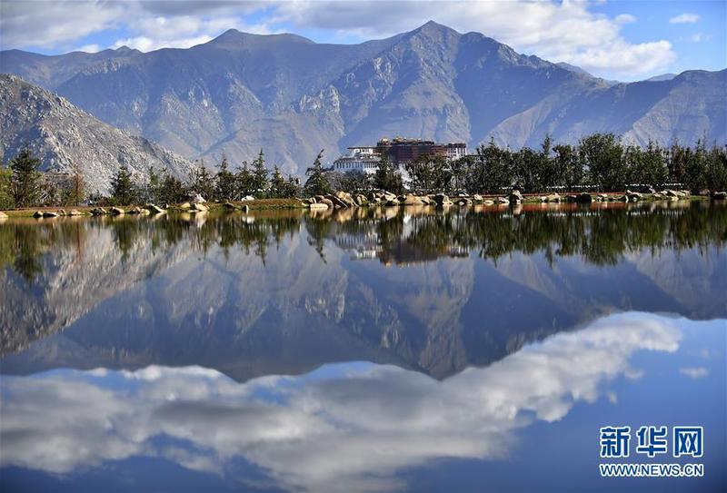 蓝天白云和绿水之间的布达拉宫(6月5日摄)。新华社记者觉果摄