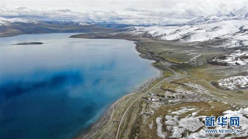 8月31日无人机拍摄的羊卓雍错及边上的307省道。新华社记者晋美多吉摄