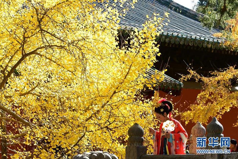 11月11日,一名汉服爱好者在大觉寺内的古银杏树旁留影。新华社记者尹栋逊摄