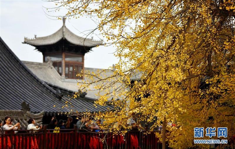 11月11日,游客在罗汉洞村古观音禅寺观赏千年银杏树。