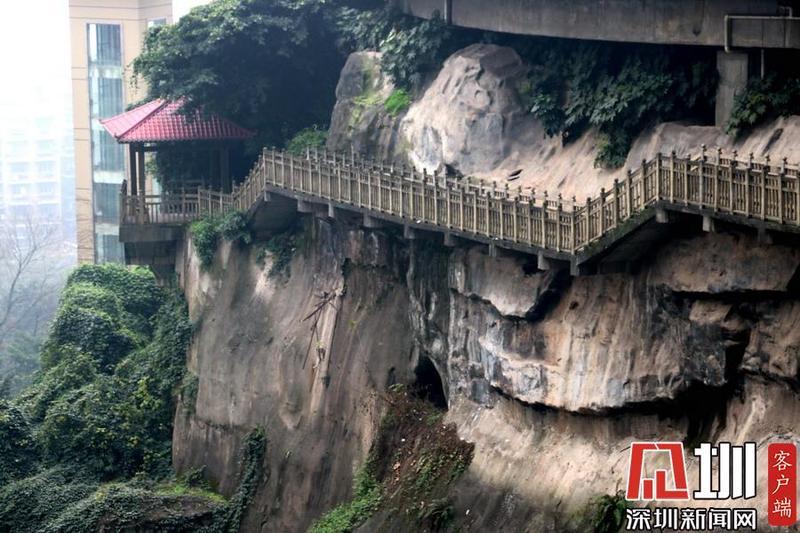 2019年1月15日,重庆市渝中区肖家湾,一小区在悬崖绝壁上修建一米宽的“悬空栈道”,方便小区市民出行,栈道离地40余米,走在上面令人胆战心惊。