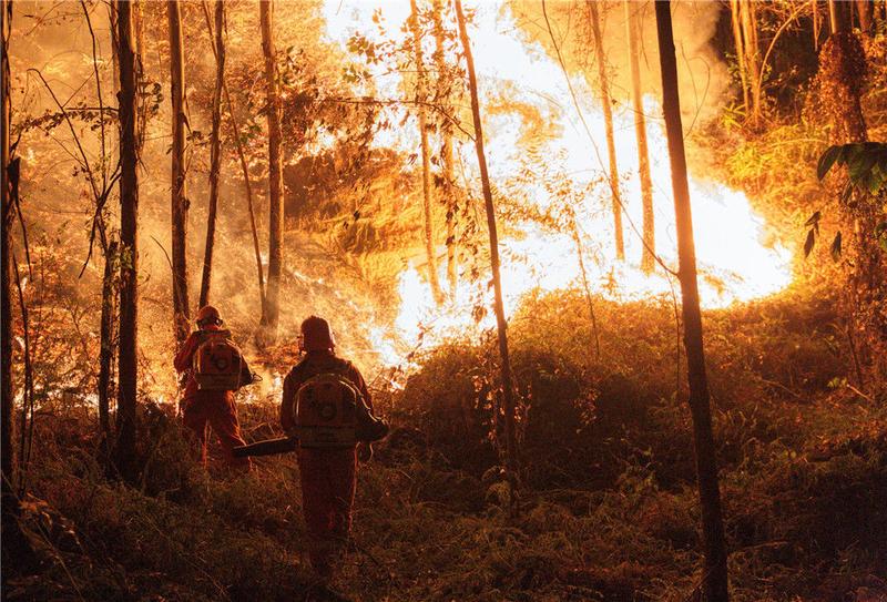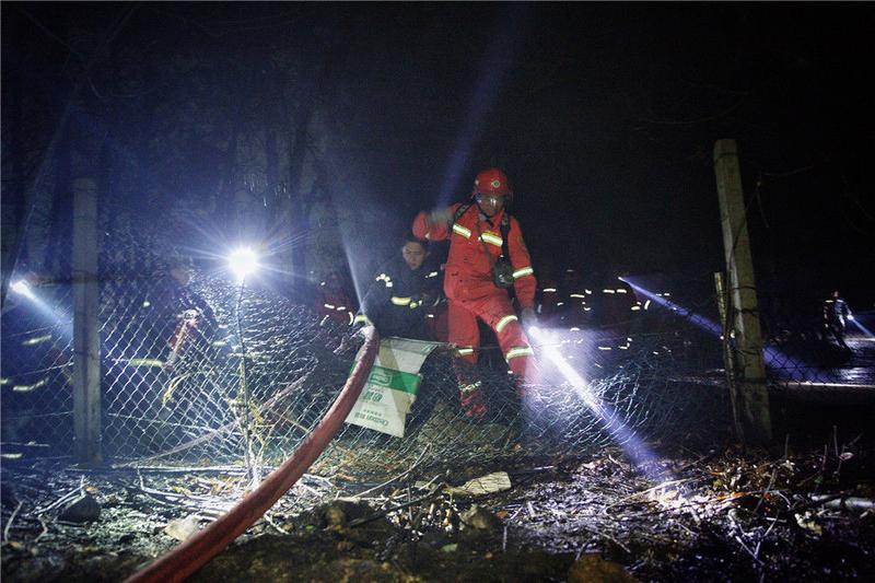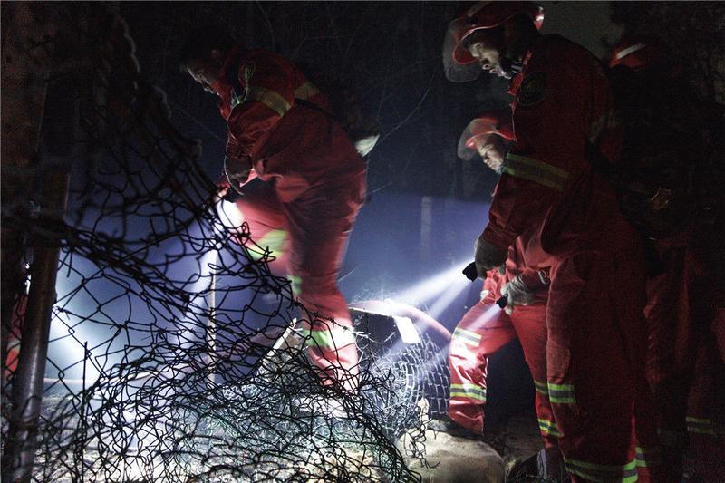 2019年12月7日凌晨一时多,广东佛山,来自英德东华镇的消防员们摸黑上山作业。经过大约一个小时的奋战后,山头明火得到有效控制。
