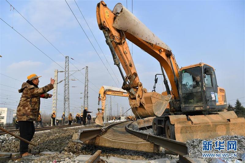 1月7日,中铁七局的铁路建设者在驳接铁路线路。 新华社记者 刘潇 摄