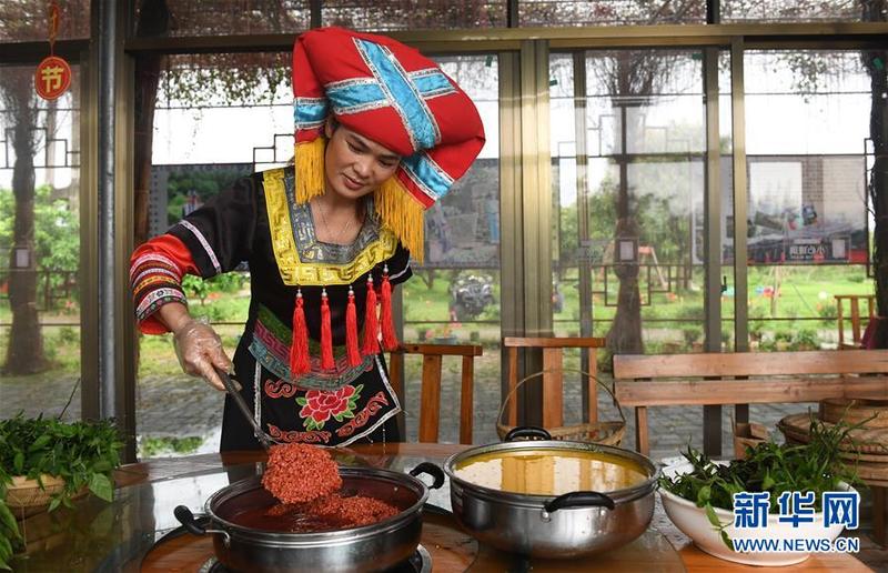 4月16日,在贵州省台江县姊妹街哆蝶五彩姊妹饭体验店,苗家妇女在制作五彩“姊妹饭”。新华社发(刘开福摄)
