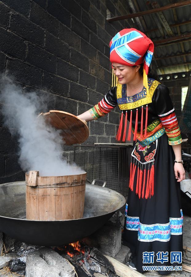4月17日,在贵州省台江县姊妹街哆蝶五彩姊妹饭体验店,苗家妇女在蒸煮五彩“姊妹饭”。新华社记者杨文斌摄