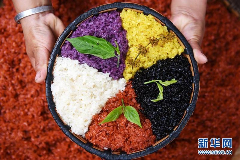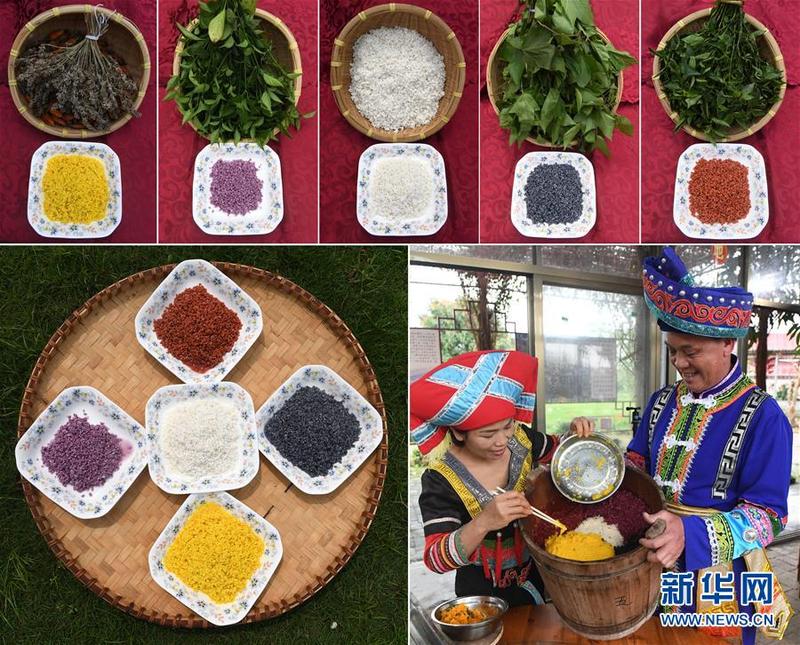 上五图:4种不同植物及其色素染成的糯米和原色糯米;下左图:4种不同植物色素染成的糯米和原色糯米;下右图:在广西上林县巷贤镇,两名壮族村民在查看一桶刚刚蒸熟的五色糯米饭(拼版图片,3月25日摄)。每年“壮族三月三”到来之际,广西的壮族同胞都有蒸制五色糯米饭迎接节日的习俗,以祈祷五谷丰登,五福临门。这些五色糯米饭,主要采用天然植物萃取色素,将糯米分别浸泡到紫、黄、红、黑4种不同植物色素的水里,充分染色后,与原色糯米一起蒸熟而成。色泽鲜艳、清香诱人的五色糯米饭,是“壮族三月三”接待来客时必不可少的传统美食。新华社记者陆波岸摄