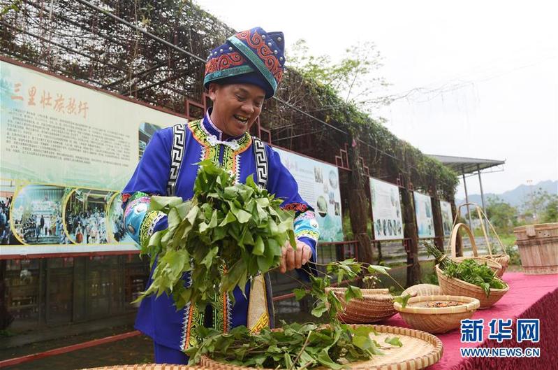 3月25日,在广西上林县巷贤镇,一名壮族村民在准备做五色糯米饭。新华社记者陆波岸摄