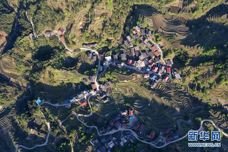 这是融水苗族自治县杆洞乡小河村高羽苗寨的木楼和梯田(3月31日摄,无人机照片)。新华社记者黄孝邦摄