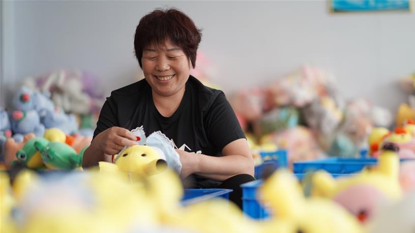 7月13日,河北省内丘县一家玩具生产企业工人在加工毛绒玩具。