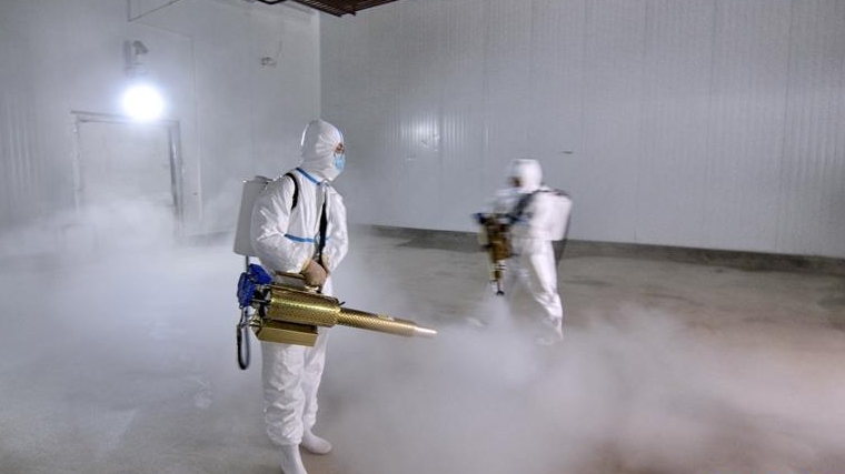 7月14日,北京二商肉类食品集团有限公司员工在对肉类运输车辆停靠区域进行防疫消毒。