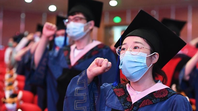 由于疫情防控需要,仅少量在校毕业生在中国政法大学昌平校区礼堂现场参加毕业典礼,更多毕业生通过线上直播参与。