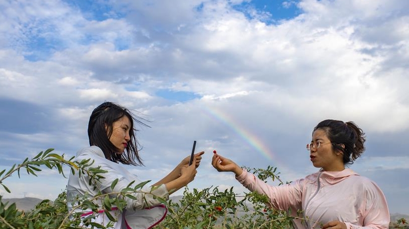 7月13日,在新疆精河县托里镇的一处枸杞种植园,村民在采收枸杞。
