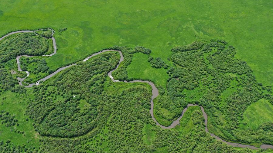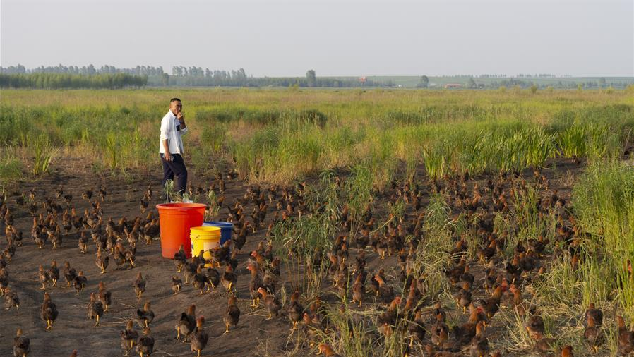 7月2日,在黑龙江省五大连池市的草原上,桑庆军在三轮车上抛撒饲料喂鸡。