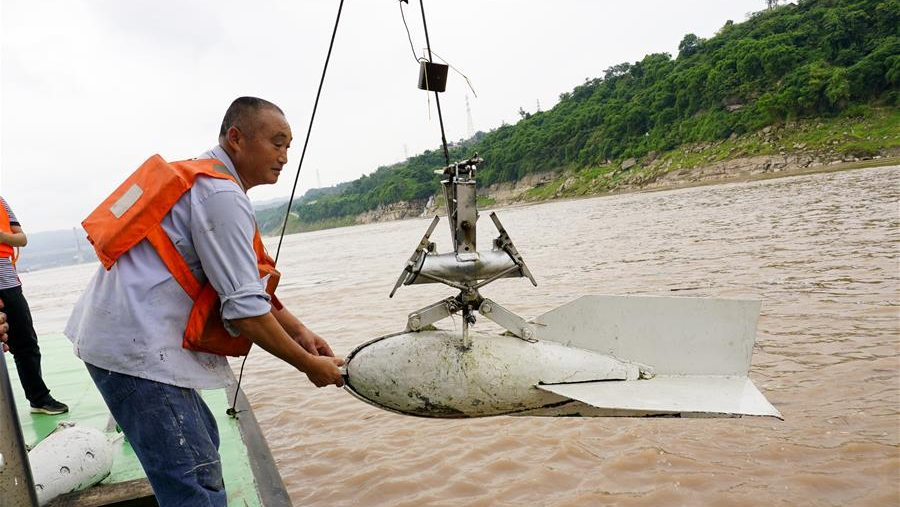 7月2日,在水文作业船上,长江清溪场水文站工作人员将水样采集铅鱼放入水中。