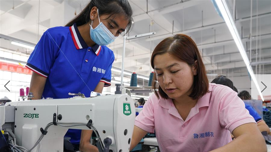 6月11日,在新疆喀什市一家服装企业生产车间里,组长艾尼皮古丽·玉麦尔(右)在指导工人缝制布料。