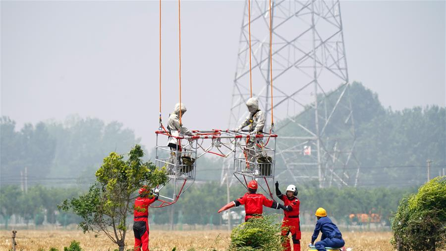 6月18日,直升机用吊篮把两名检修人员“吊”到有缺陷的特高压线路上。