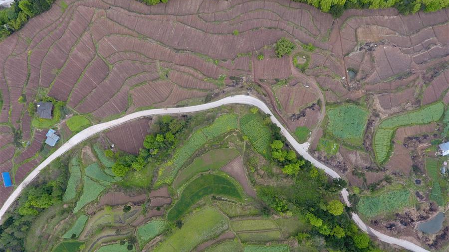 江苏宿迁三台山森林公园鲜花竞相开放,空中俯瞰,好似铺撒在大地上的五彩画卷。