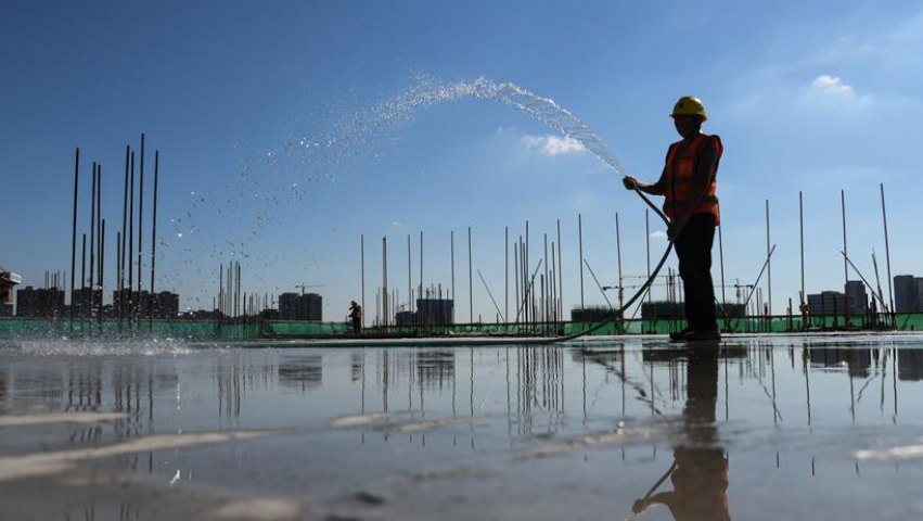 8月3日,工人在长江文创产业园项目工地工作平面浇水降温。