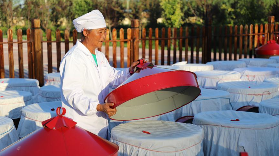 黑龙江省绥化市青冈县芦河镇东升村贫困户李淑琴在酱厂工作(7月21日摄)。