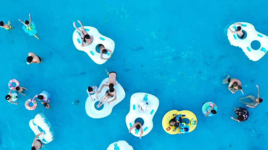 市民在南昌保利冰雪水世界戏水游玩(8月3日摄)。