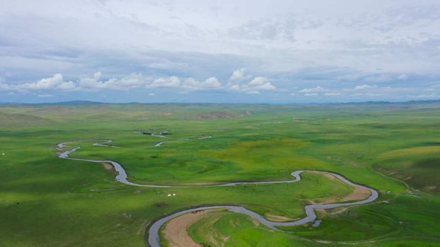 这是在呼伦贝尔陈巴尔虎旗牧云山顶拍摄的莫日格勒河(8月3日摄,无人机照片)。