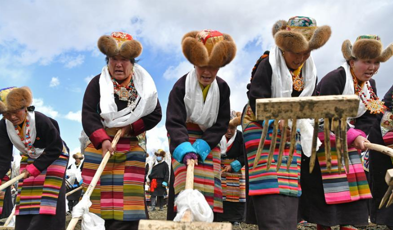 当日,西藏各地男女老幼身着节日盛装,驾着一辆辆由彩旗、花朵装扮一新的拖拉机,涌向待垦的农田,载歌载舞迎来一年一度的开耕仪式。