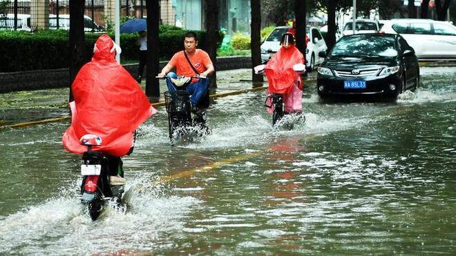 河北石家庄遭遇暴雨 道路积水民众涉水出行