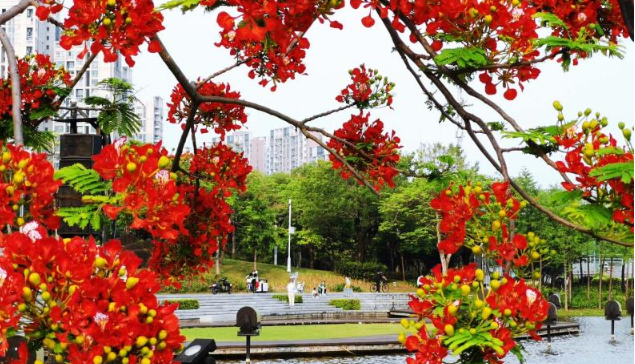 近日,深圳的凤凰花进入花期。TCL科技园内,随处可见盛开的凤凰花。