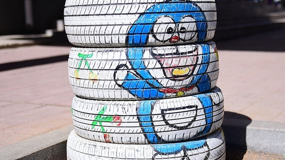 5月4日,二十余个印有卡通图案及奥运五环造型等创意轮胎花盆亮相沈阳,吸引市民。多啦A梦卡通轮胎