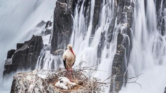 4月22日,一群天鹅在沽源县闪电河国家级湿地公园的天鹅湖觅食。