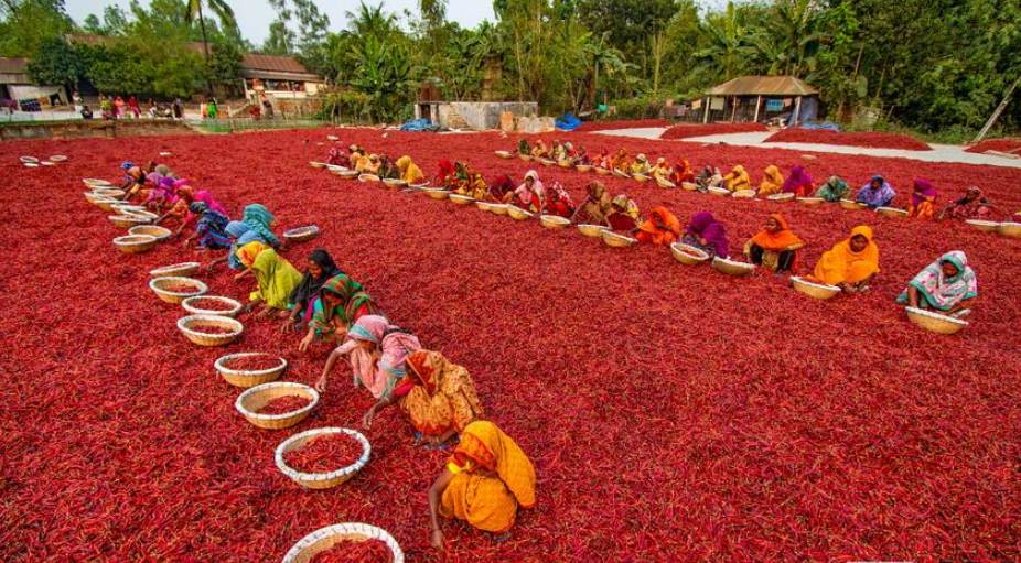 航拍孟加拉国工人分拣辣椒 满眼火红大地如铺上地毯