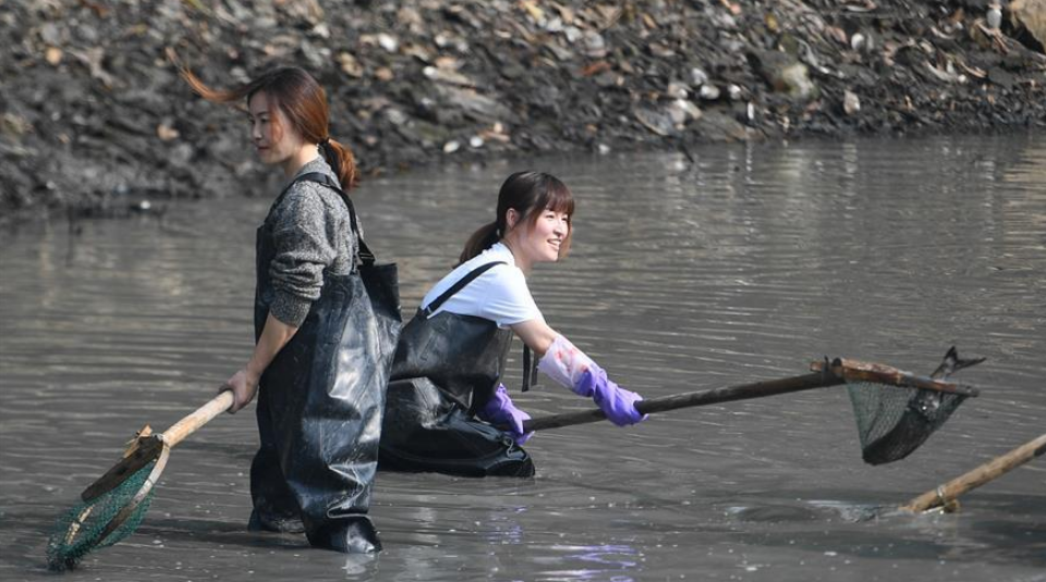 近日在杭州西溪国家湿地公园,渔夫们抽掉塘水清理淤泥,一批游客借用渔夫们的下水裤,体验“干塘”捕鱼。