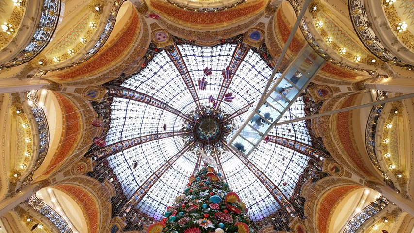 近日,法国巴黎老佛爷百货公司立起巨型圣诞树,璀璨的灯光和精美的造型设计吸引了众多市民和游客前来参观。