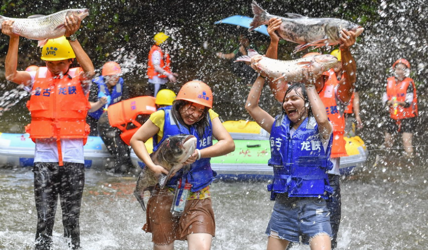 2019年8月2日,广东清远,台风“韦帕”不但带来风雨,还给游客带来捕鱼之乐。