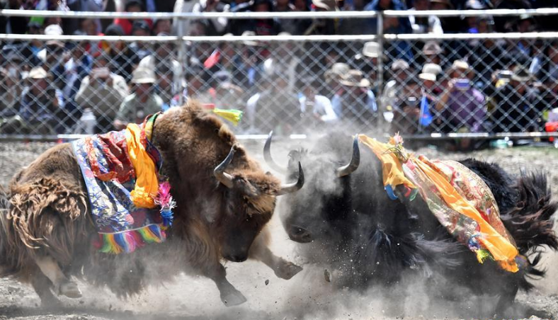 者下乡斗牛节历史悠久,是西藏自治区非物质文化遗产。牧民为参加比赛的种牦牛披绸挂缎,将牛群赶到位于日喀则市白朗县者下乡的斗牛场上。