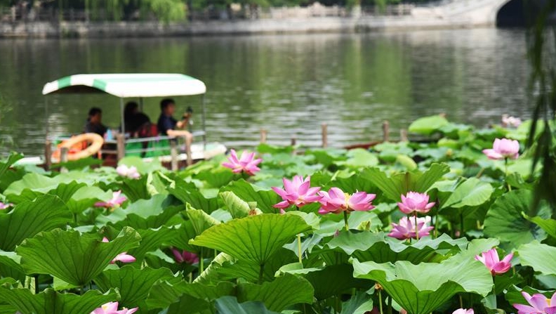 近日,山东济南大明湖的荷花陆续绽放,吸引游客前来观赏。