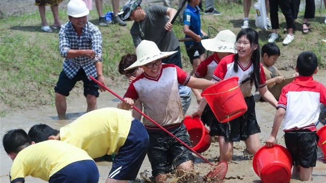 在浙江省杭州市富阳区东洲街道红旗村的劳动教育实践基地,数百名中小学生与家长参加了趣味插秧和浑水摸鱼等活动,体验农事劳动。