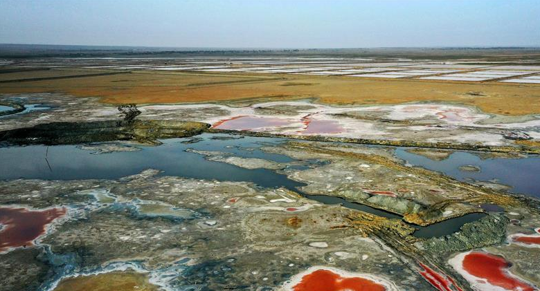 定边盐湖群是陕西唯一的湖盐产区。其中最大的盐湖——苟池,由于湖中含有大量藻类和不同矿物质成分,阳光下呈现出绚烂色彩,美不胜收。